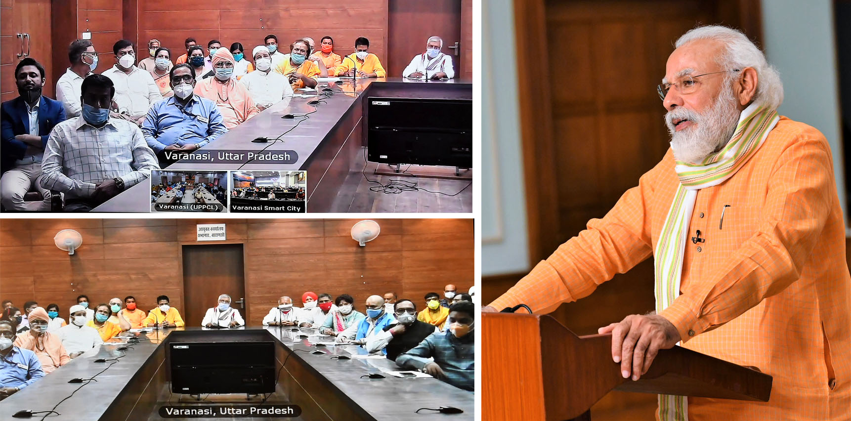*The Prime Minister, Shri Narendra Modi interacts with representatives from Varanasi based NGOs via video conference, in New Delhi on July 09, 2020.