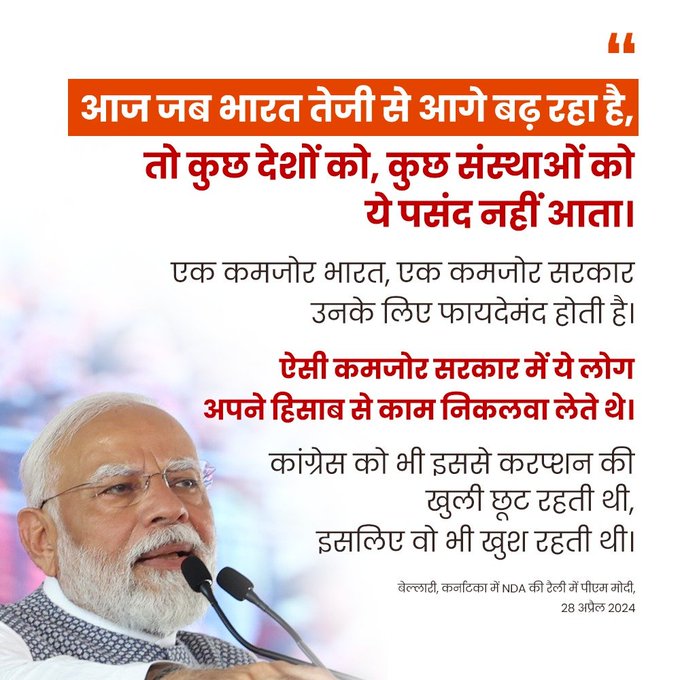 In his final rally in Ballari, the crowd appeared highly enthusiastic to hear from their favorite leader. PM Modi remarked, “Today, as India advances rapidly, there are certain countries and institutions that are displeased by it. A weakened India, a feeble government, suits their interests. In such circumstances, these entities used to manipulate situations to their advantage. Congress, too, thrived on rampant corruption, hence they were content. However, the resolute BJP government does not succumb to pressure, thus posing challenges to such forces. I want to convey to Congress and its allies, regardless of their efforts... India will continue to progress, and so will Karnataka.”