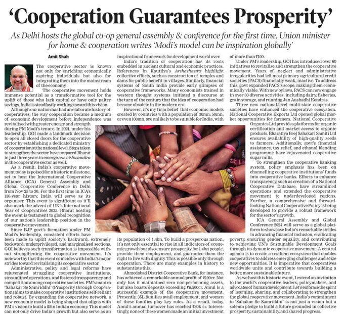 Bharat has revived its rich history of cooperatives to uplift the marginalized section. Today, PM Shri @narendramodi Ji's vision of 'Sahakar Se Samriddhi' is a mission statement for the world. Read my article in @timesofindia.